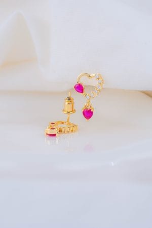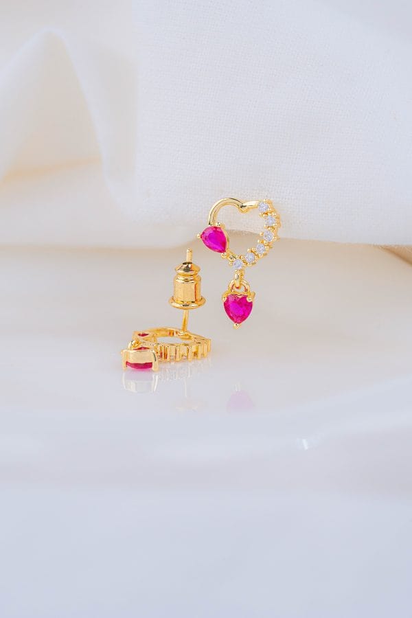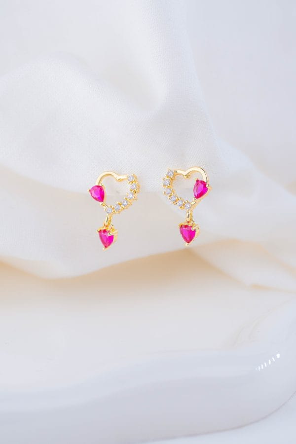 Aretes de diseño delicado en forma de corazón, con circón rosa y microcircones que aportan brillo y un toque romántico, ideales para acompañarte en momentos especiales y recordarte la alegría de los pequeños detalles llenos de amor. • Diseño de corazón • Circón rosa protagonista • Detalle de microcircones brillantes • Acabado dorado brillante • Estilo femenino y romántico • Cómodos y livianos • Perfectos para uso diario o para regalar con intención