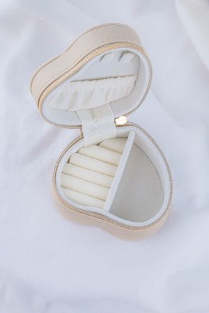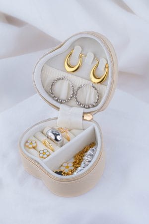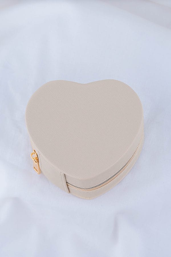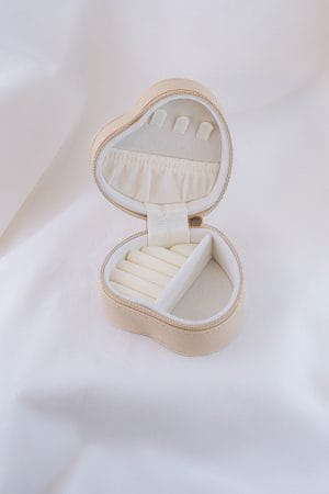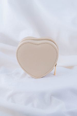 Nuestro joyero viajero es el compañero ideal para llevar tus accesorios favoritos de forma organizada, segura y con mucho estilo. Su delicada forma de corazón y su acabado neutro y elegante lo convierten en una pieza tan linda como funcional. Cuenta con un interior suave y acolchado, diseñado para proteger tus joyas del roce y los golpes. • Ranuras acolchadas para anillos • Ganchos para aretes • Compartimentos independientes para collares, pulseras y piezas pequeñas • Cierre con cremallera metálica segura que mantiene todo en su lugar • Diseño compacto, práctico y femenino • Ideal para viajes, bolsos, regalos o para organizar tus joyas en casa sin ocupar mucho espacio. No incluye accesorios.